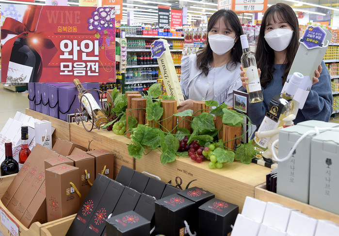 농식품 전문매장 농협 하나로마트를 운영하는 농협유통(대표 정연태)은 오는 11월 10일까지, ‘2021 우리 술 품평회’ 과일주 부문 최우수상과 우수상을 수상한 충북 영동 와인 모음전을 개최한다. 사진은 모델들이 영동와인을 선보이고 있다.(사진=농협유통 제공)