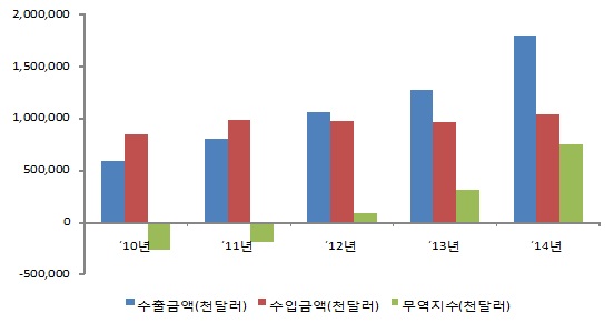 화장품 무역수지는 수출 증가에 따라 흑자로 돌아선 2012년 이후 계속해서 흑자를 유지하고 있으며, 2014년 무역수지는 2012년 대비 8배 이상 증가한 7억5250만 달러 흑자를 기록했다.