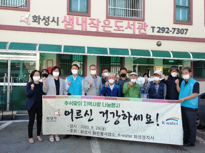 행사는 25일 매송면 천천리 경로당에서 열려 맑은물사업소와 K-water 화성권관리단 임직원이 모은 250만원 상당의 성금으로 마련한 생필품이 전달됐다.