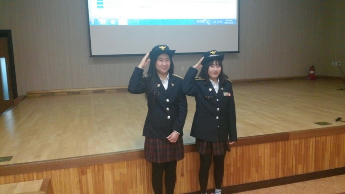 ▲고창여중생들이 경찰제복을 입고 경례를 하고 있다. 고창경찰서 제공 |