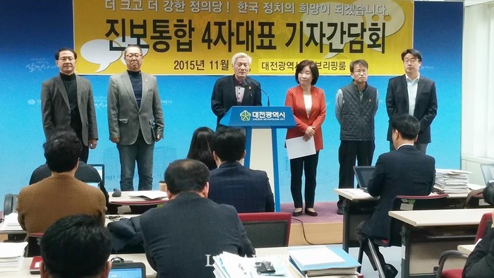 ▲9일 오후 2시 대전시청 브리핑룸에서 진보통합 4자 대표(정의당, 국민모임, 노동정치연대, 진보결집더하기)가 기자회견을 열고 있다, 조윤찬 기자 |