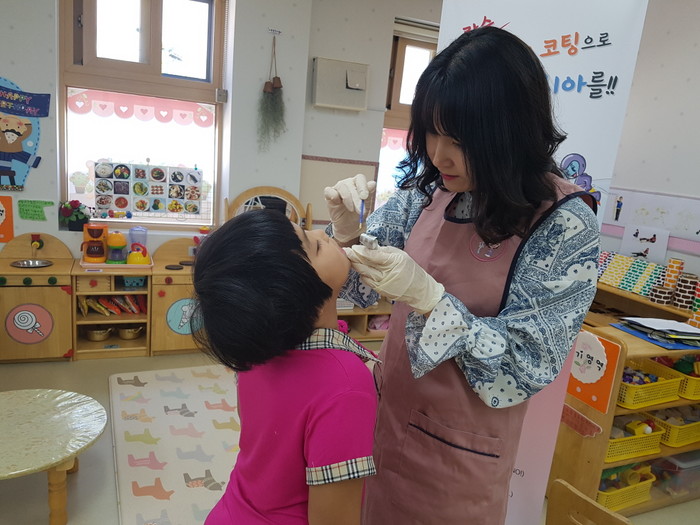 | ▲경북 성주군은 4일부터 6월 말까지 어린이집 및 사립유치원 12개소 518명의 아동을 대상으로 어린이 충치예방을 위한 불소도포를 실시한다.(성주군 제공) |