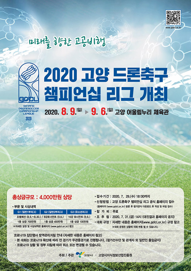 [로컬세계 강영한 기자]경기 고양시는 오는 8월부터 9월까지 2개월 동안 국내 최초, 전국 규모의 ‘고양 드론 축구 챔피언십 리그(Goyang Dronesoccer Championship League, GDCL)’를 개최한다.