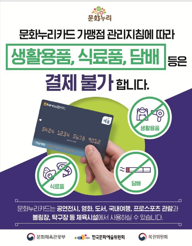 문화·여행·체육 분야의 전용 선불카드인 ‘문화누리카드’는 6세 이상의 기초생활수급자와 차상위 계층에게 발급된다. 신청은 2월 1일부터 전국 행정복지센터와 문화누리카드 누리집을 통해 할 수 있다.