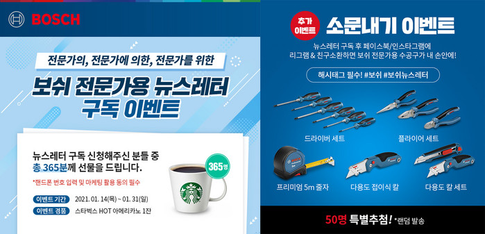 또한 소문내기 이벤트는 뉴스레터를 구독한 후, 페이스북 또는 인스타그램에 #보쉬 #보쉬뉴스레터 해시태그와 함께 이벤트 게시물을 리그램하고 친구 소환을 하면 된다. 참여자 중 50명을 추첨해 보쉬의 전문가용 수공구인 ▲스크류드라이버 세트 ▲플라이어 세트 ▲프리미엄 5m 줄자 ▲다용도 접이식 칼 ▲다용도 칼 세트 중 하나를 랜덤으로 발송한다.