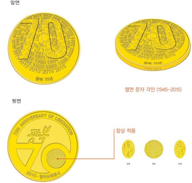 금메달 앞면에는 광복 이후 70년간 이룩한 경제, 문화, 사회적 발전의 위대한 시간을 나이테로 표현했고 ‘광복 70’이라는 칭호를 정중앙에 배치했다. 뒷면에는 태극문양을 모티브로 보는 각도에 따라 ‘1945’와 ‘2015’로 보이는 잠상기술이 적용됐으며 메달 테두리에는 ‘1945-2015’ 문자를 각인했다.