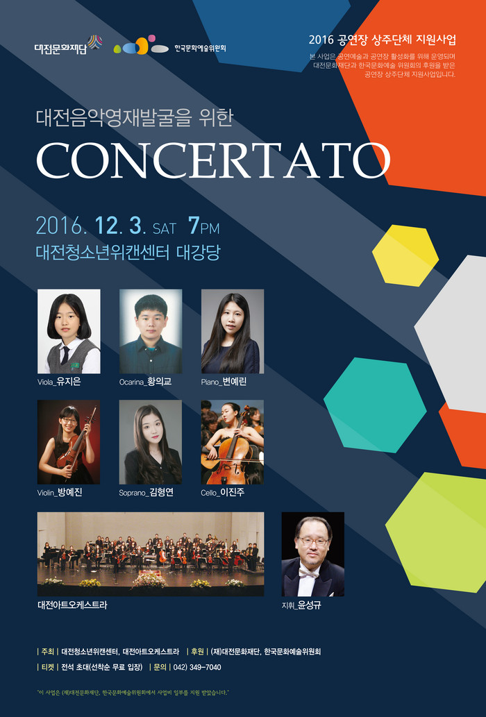 한편 콘체르타토(CONCERTATO) 공연은 오는12월 3일 오후 7시 대전청소년위캔센터 대강당에서 열린다. 전석 초대(선착순 무료 입장)이다.