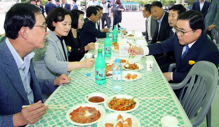 | ▲허성무 창원시장(오른쪽 첫번째)이 피조개 요리 시식회를 하고 있다.(창원시 제공) |