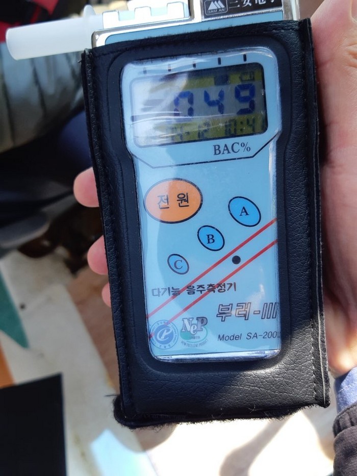 ▲낚싯배 선장 검거 당시 혈중알콜농도 0.049%.(군산해양경찰서 제공) |