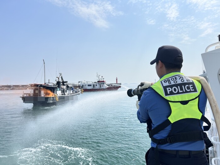 ▲ 지난 4월 12일 해경이 전북 군산시 비응항 일대에서 민관이 함께하는 정박어선 화재 대응 훈련을 실시하고 있다. |