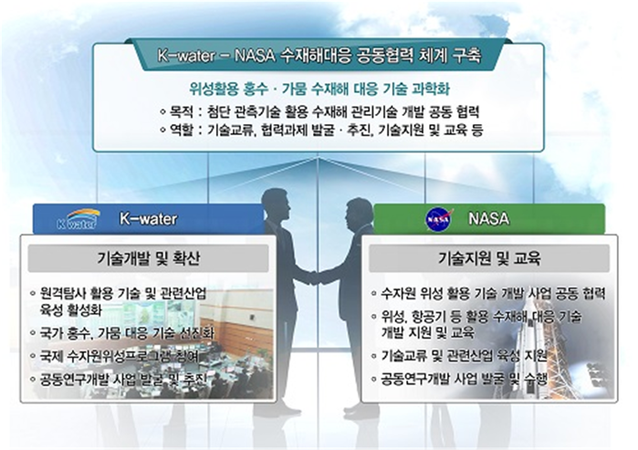 수자원공사는 오는 19일 오전 10시 대전시 대덕구 본사에서 미국 항공우주국 나사(NASA)와 ‘물관리 및 수재해 분야 위성활용 기술 공동개발’ 이행각서를 체결한다고 18일 밝혔다.