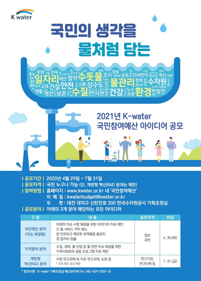 한국수자원공사(사장 박재현)는 국민이 직접 물 관련 이슈에 대한 해결방안을 제안하고, 예산편성 과정에 참여하는 ‘국민참여예산제’를 실시키로 하고 오는 29일부터 국민 아이디어 공모를 진행한다고 28일 밝혔다.