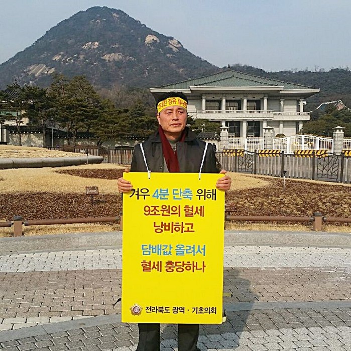 ▲조규대 익산시의회 의장이 서울 청와대 앞에서 호남고속철도 서대전역 경유 재검토 철회를 촉구하는 1인 시위를 하고 있다. |