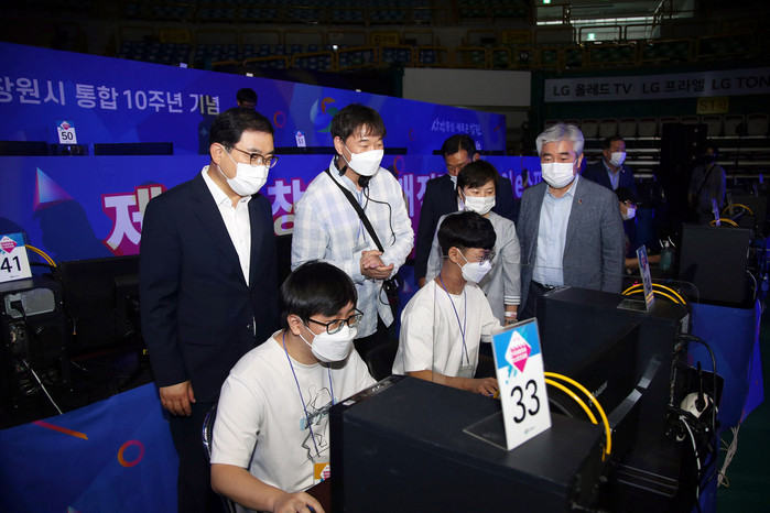 | ▲지난 6월 ‘제1회 창원시장배 전국 아마추어 e스포츠 대회’에서 허성무 시장이 선수들의 경기를 보고 있다.(창원시 제공) |