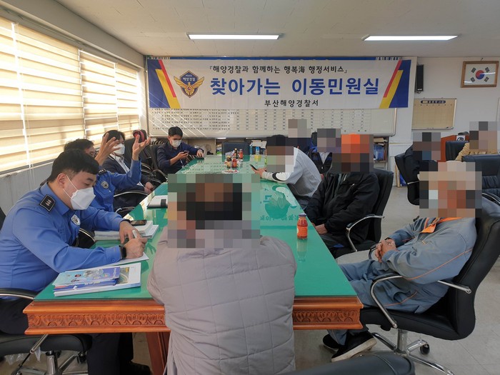 ▲이동민원실에서 민원인들의 상담을 듣고 있다.(부산해양경찰서 제공) |