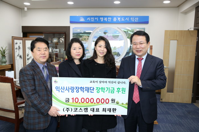 익산시 신흥동에 소재한 코스켐은 광택제인 산업용 왁스 등을 생산해 해외에 수출하는 회사로 지역경제 활성화에 크게 이바지하고 있다. 최재환 사장은 “작은 정성이지만 지역의 미래를 건설할 학생들에게 꿈과 희망을 불어 넣어 주는데 보탬이 되길 바란다”고 말했다.