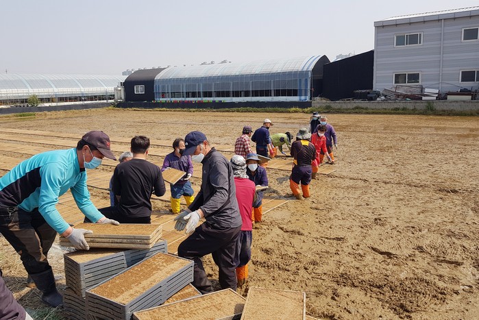 [로컬세계 고용주 기자]경기 수원시는 29일 오전 권선구 입북동 농지에 자연재해· 병해충 피해 등으로 (벼) 묘가 부족한 상황에 대비해 모내기가 어려운 농가에 묘판을 공급할 수 있도록 예비 묘판을 설치했다.