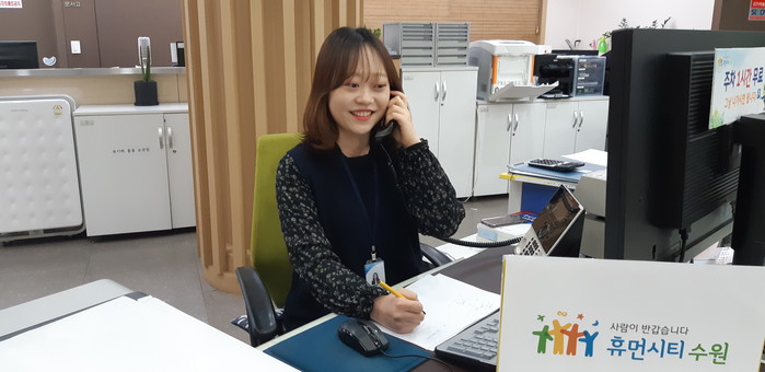 | ▲수원시 시민봉사과 공무원이 전화로 민원을 처리하고 있다. |
