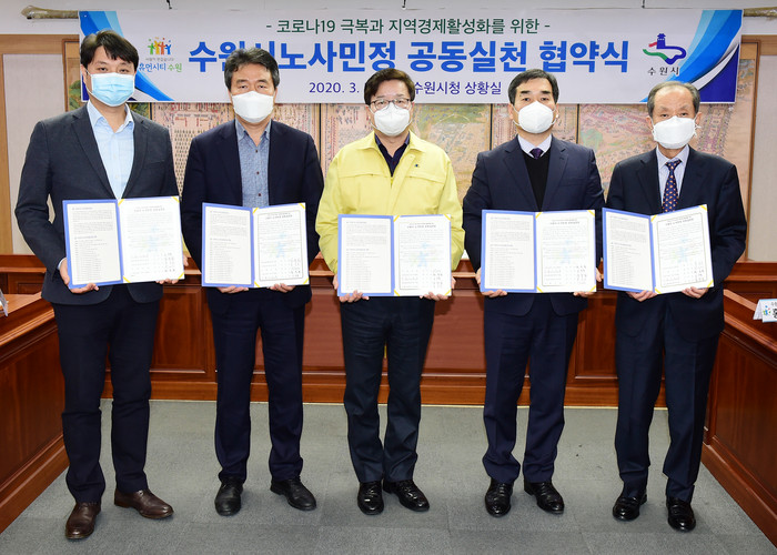특히 이날 회의에서 노사민정협의회는 코로나19 위기 극복을 위한 수원시 대응 매뉴얼에 적극 동참하겠다는 뜻이 담긴 공동실천문에 서명했다.
