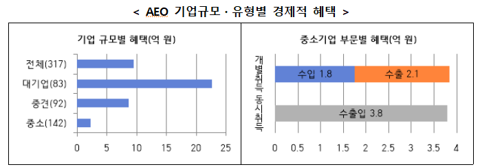 관세청은 금액으로 환산 가능한 AEO 혜택을 정량적으로 분석한 결과, 대기업은 평균 22억 6천만 원, 중견기업은 8억 6천만 원, 중소기업은 2억 3천만 원의 경제적 효과를 본 것으로 나타났다. 특히 중소기업의 경우 수출입 양 부문을 모두 공인받은 기업은 평균 3억 8천만 원의 혜택을 누린 것으로 분석됐다.