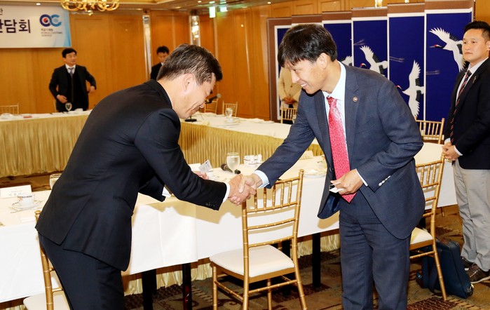 | ▲김영문 관세청장(오른쪽)이 해외통관애로 간담회 참석자들과 인사를 나누고 있다. |