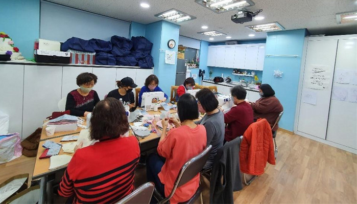 | ▲매송면 야목5리 휴먼시아 아파트 마을공동체가 마스크를 제작하는 모습. |