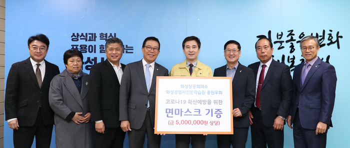 | ▲화성상공회의소·화성경영자 인문학습원 총원우회가 13일 면마스크 3천매를 후원하고 서철모 시장(가운데)과 기념촬영하고 있는 모습.(화성시 제공) |