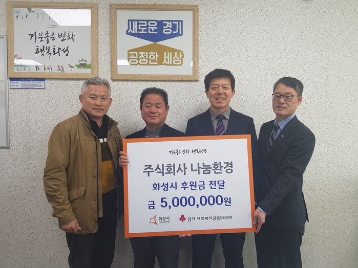 | ▲나눔환경이 13일 화성시에 코로나19로 힘든 이웃들에 써달라며 500만원을 기부했다. |