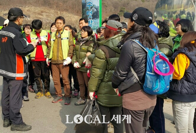 ▲김광수(왼쪽 6번째) 서울시의원과 수암사랑나눔이 봉사단 회원들이 노원소방서 관계자로부터 불암산 산불현장에 관한 브리핑을 받고 있다. ©로컬세계 |