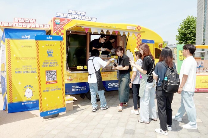 ▲요리교실 오픈 기념식 참석자들이 푸드드럭 '행복 米(미) 밥차'에서 쌀 간편식 등 간식을 받고 있다. 농협 제공 |