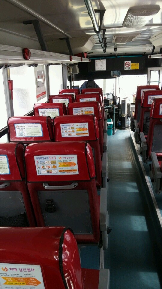 | ▲시내버스 내부 좌석시트에치매검진절차 및 치매예방수칙 홍보 내용을 홍보하고 있다.(성주군 제공) |