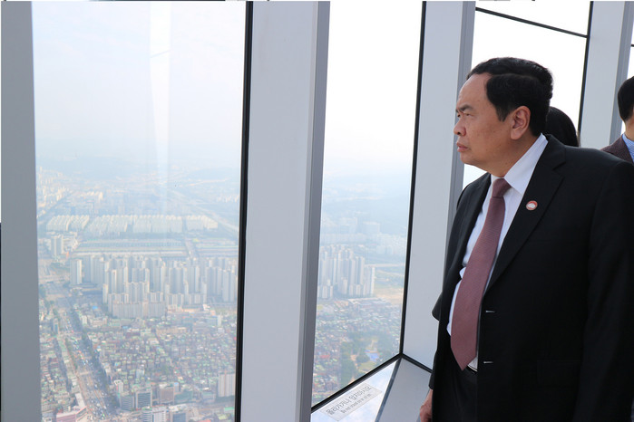 한국국제교류재단의 초청으로 방한한 쩐 타인 먼 베트남 조국전선위원장이 지난 28일 서울 송파구 롯데월드타워 전망대 서울스카이를 방문해 스카이테라스를 체험하고 있다.