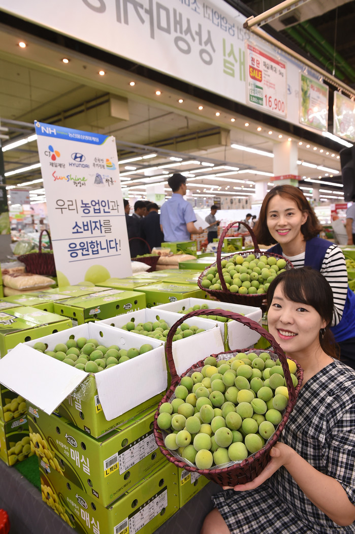| ▲30일 서초구 하나로마트 양재점에서 CJ제일제당, 현대자동차 및 지자체(광양시, 순천시, 하동군)의 후원으로 ‘매실 특별판매전’을 개최했다.(농협유통 제공) |