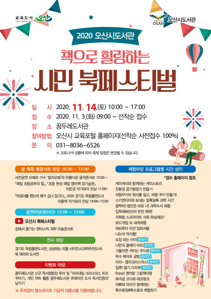 ‘2020 오산시 북페스티벌’은 ‘도서관과 함께하는 힐링 북캉스’를 테마로 오산시 도서관 봉사단체인 키움봉사회, 관내 학교, 시민독서회가 중심이 돼 다양한 프로그램을 선보인다.