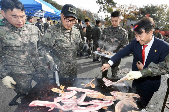 | ▲12일, 경기도 고양시에 위치한 육군 제1군단사령부에서 열린 한돈 삼겹살 회식에서 하태식 한돈자조금위원장이 병사들에게 삼겹살을 구워 주고 있다. 한돈자조금은 이달 15일까지 지난 ASF 방역지원에 큰 도움을 준 파주·연천 등 군부대에 총 5,000만원 상당의 한돈을 전달할 계획이다. |