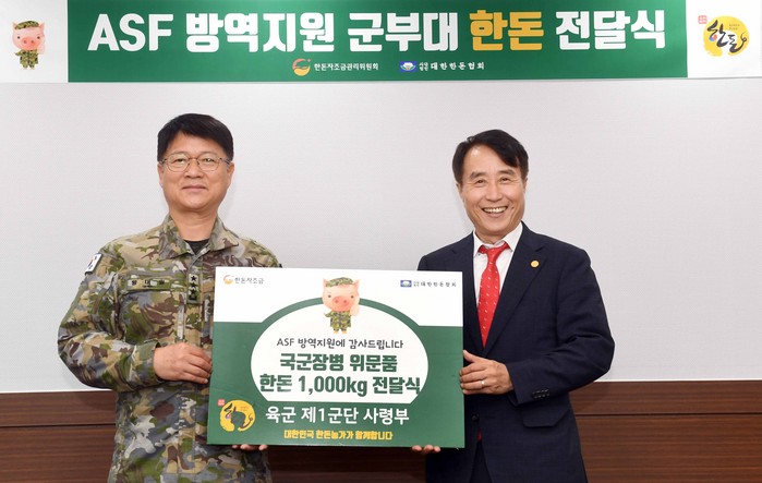 하태식 위원장은 12일, 경기도 고양시에 위치한 육군 제1군단사령부(군단장 황대일 중장)를 방문해 파주지역 ASF 방역에 힘써준 장병들을 격려하고, 황대일 군단장에게 1,500만원 상당 한돈을 전달했다.