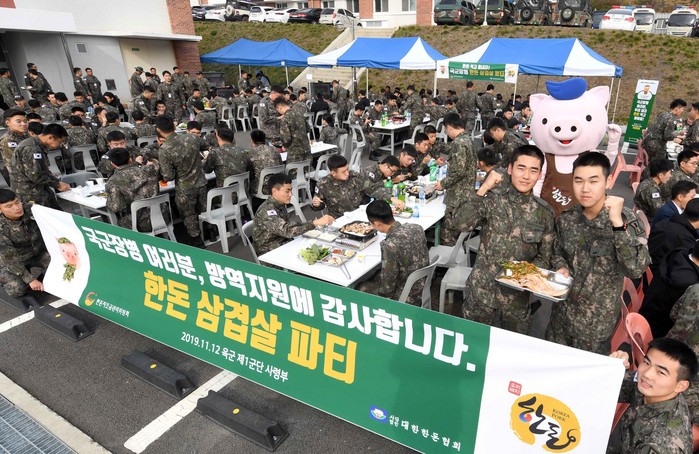 | ▲12일, 경기도 고양시에 위치한 육군 제1군단사령부에서 열린 한돈 삼겹살 회식에서 병사들이 삼겹살을 먹으며 즐거워하고 있다. 한돈자조금은 이달 15일까지 지난 ASF 방역지원에 큰 도움을 준 파주·연천 등 군부대에 총 5,000만원 상당의 한돈을 전달할 계획이다. |