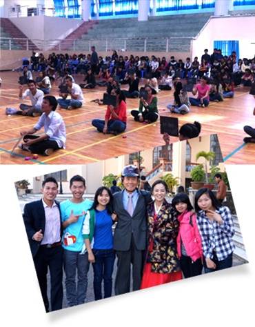 ▲달랏대 학생들이 한국 문화를 체험하고 있다.(위) 한·베문화교류협회 유태현 회장이 달랏대 학생들과 기념촬영을 하고 있다. |