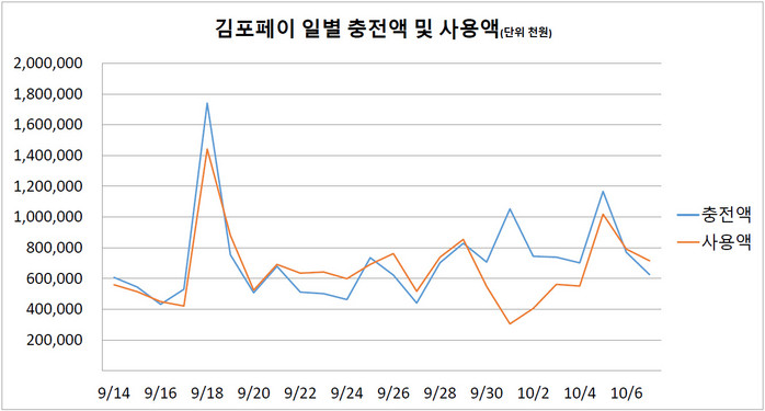 이는 전날 5억3050만원 충전, 4억2109만원 사용 등 통상 매일 4억 원~5억원대의 충전액, 사용액에 비해 3배가량 규모가 늘어난 금액이다.
