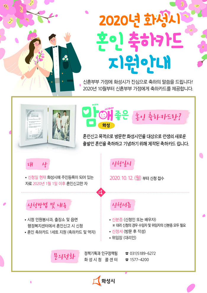 [로컬세계 고용주 기자]경기 화성시는 신혼부부의 새로운 인생을 축하하고 가정의 소중한 의미를 되새길 수 있도록 혼인 축하카드를 배포한다고 12일 밝혔다.