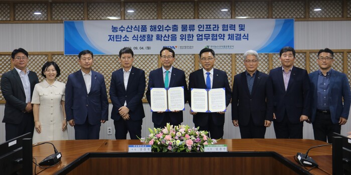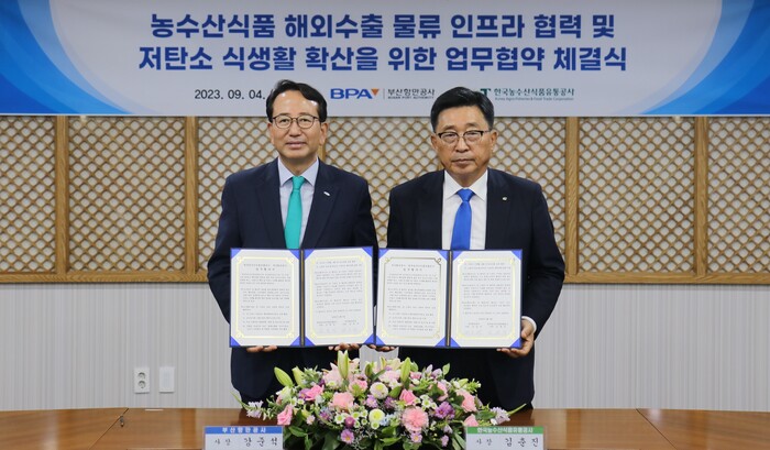 한국농수산식품유통공사(사장 김춘진)와 부산항만공사는 4일 부산항만공사 본사에서 농수산식품 수출경쟁력 강화를 위한 해외 물류 인프라 협력과 저탄소 식생활 확산을 위해 업무협약을 체결했다.