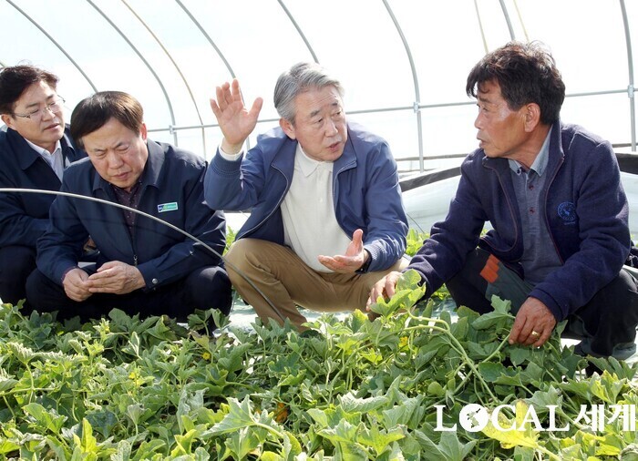 ▲ 강호동 농협중앙회장(왼쪽 두번째)은 15일 경북 성주군 참외농가를 방문해 일조량 부족에 따른 생육부진피해현장을 점검하고, 농업인을 위로했다. |