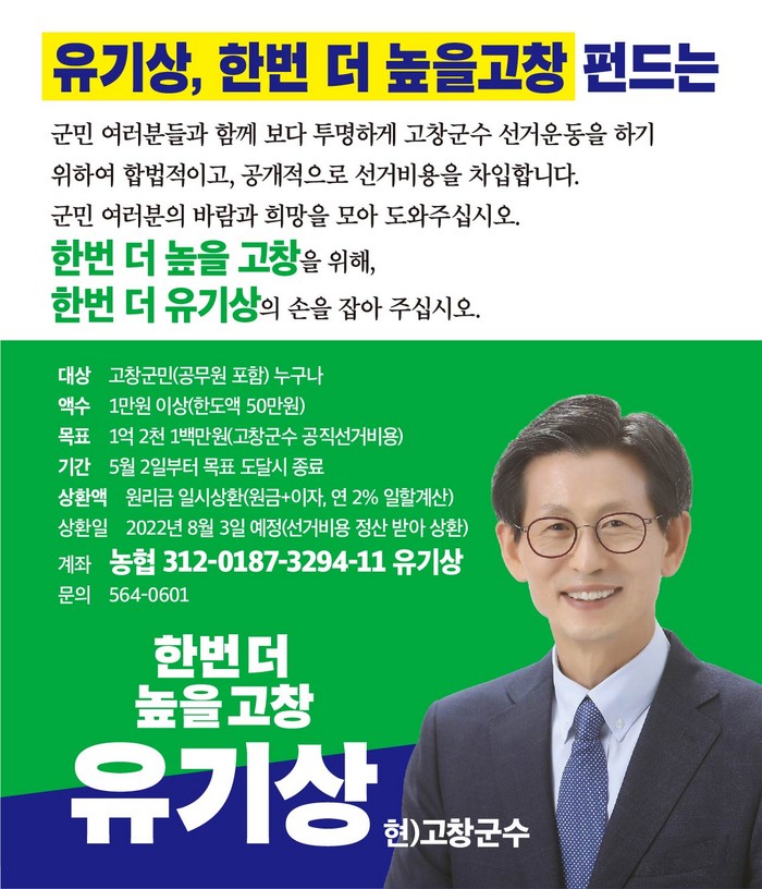 이날 유 예비후보 선거사무소에 따르면 ‘유기상, 한번 더 높을고창’ 펀드는 5월 2일부터 고창군수 공직선거비용인 1억2100만원을 목표로 달성시까지 모금한다.