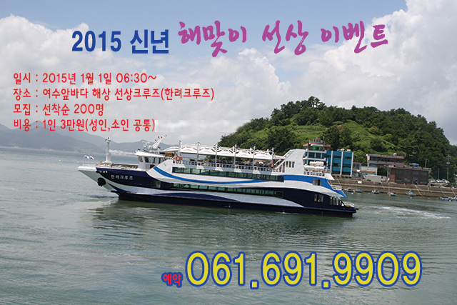 이 상품은 새해 1월 1일 아침 6시30분 대형 크루즈 선박인 ‘한려크루즈’에 승선한 뒤 여수 앞바다에서 일출을 감상할 수 있다.