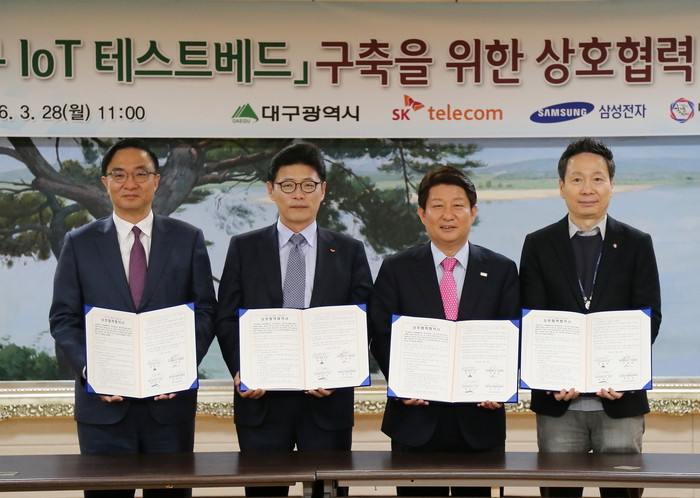 이날 권영진 대구시장, 이형희 SK텔레콤 사업총괄, 김영기 삼성전자 사장, 김선일 대구창조경제혁신센터장 등은 IoT 인프라 구축, 에너지 효율화, 상생편드를 통한 벤처·스타트업 지원 등에 상호협력 하기로 했다.