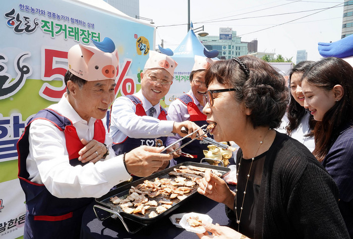 | ▲한돈농가 비영리단체 한돈자조금관리위원회는 지난 24일 서울 종로구에 위치한 일민미술관 앞 광장에서 ‘아프리카돼지열병(ASF)’ 국내유입 차단에 대한 국민협조를 구하고, 한돈농가를 응원해달라는 의미를 담아 한돈 할인판매를 진행했다. 한돈자조금 하태식 위원장(왼쪽)이 시민들에게 삼겹살을 주고 있다.(사진=한돈자조금 제공) |
