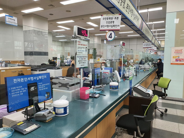 시는 민원인과 근접한 거리에서 대면 업무를 보는 민원실 특성상 직접적인 접촉을 최소화하고 비말침방울)에 의한 바이러스 감염 가능성을 차단하기 위해 본청과 보건소, 차량등록사업소와 6개 동행정주민센터 등 모든 민원창구에 투명 가림막을 설치했다.