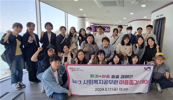 행사에 참여한 사회복지공무원들은 이기대 갈매길에 버려진 오염물을 종량제 봉투에 함께 담으며 민원 업무로 지친 서로의 마음을 다독이는 소통의 시간도 가졌다.