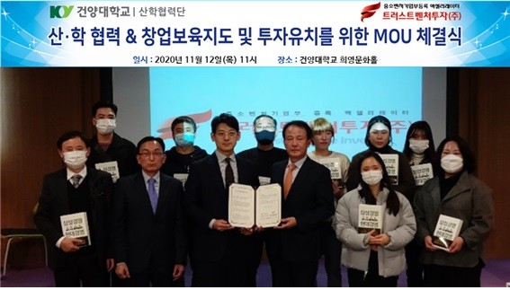 중소벤처기업부 등록 액셀러레이터인 트러스트벤처투자(주)는 건양대학교 산학협력단과의 업무협약을 통해 산학협력 및 스타트업을 지원 활성화하기 위한 창업보육지원과 교육, 투자유치, 대학생 창업동아리 활동 등을 강화하는데 양 기관의 상생협력과 동반성장을 위해 전략적 MOU를 체결하였다.