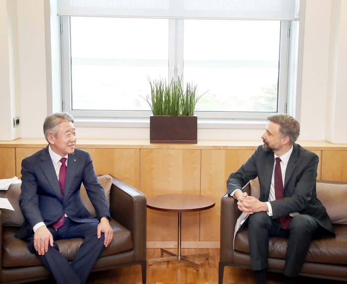 ▲농협 강호동 회장과 알바로 라리오 IFAD 총재가 이탈리아 로마 IFAD본부에서 면담하고 있다. 농협 제공 |